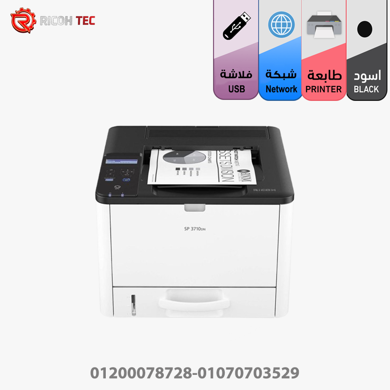 طابعة Ricoh SP 3710 ليزر أبيض وأسود عالية الأداء، مثالية للمكاتب الصغيرة والمتوسطة. توفر سرعة طباعة 37 صفحة/دقيقة، مع جودة طباعة تصل إلى 1200×1200 dpi، وتعمل بكفاءة عالية مع تكلفة تشغيل منخفضة