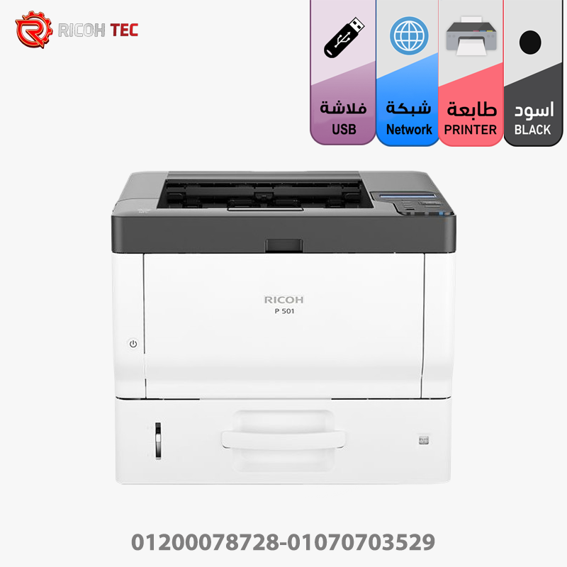 طابعة Ricoh 501 ليزر أبيض وأسود عالية الجودة، مناسبة للمكاتب والشركات الصغيرة والمتوسطة. توفر سرعة طباعة ممتازة مع دقة تصل إلى 1200×1200 dpi، وتضمن أداءً موثوقًا مع تكلفة تشغيل منخفضة